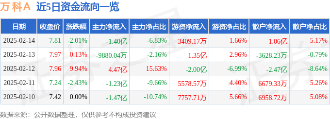 本站消息,截至2025年2月14日收盘,万 科A(000002)报收于7.81元,下跌2.01%,换手率2.71%,成交量263.0万手,成交额20.55亿元。